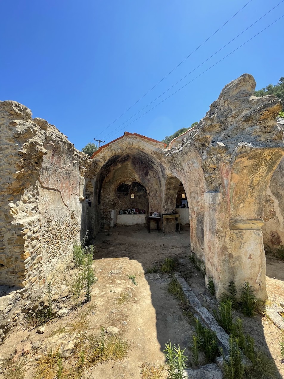 Kościół świętego Jerzego w Garipas, ukryty na skraju wąwozu Therísso, wygląda jak miejsce, które świat po prostu porzucił. Kamienne mury stoją tu jeszcze uparcie, choć dach dawno się zapadł, a druga nawa rozsypała się niemal w całości. W słońcu ten niewielki kościółek jest surowy, ascetyczny, a jednocześnie niezwykle fotogeniczny — jakby sama ruina chciała opowiedzieć historię o czasach, gdy modlitwa niosła się jeszcze spod tych wapiennych ścian. To jedno z tych kreteńskich miejsc, gdzie piękno i degradacja idą ramię w ramię, tworząc krajobraz bardziej przejmujący niż niejeden odrestaurowany zabytek.
