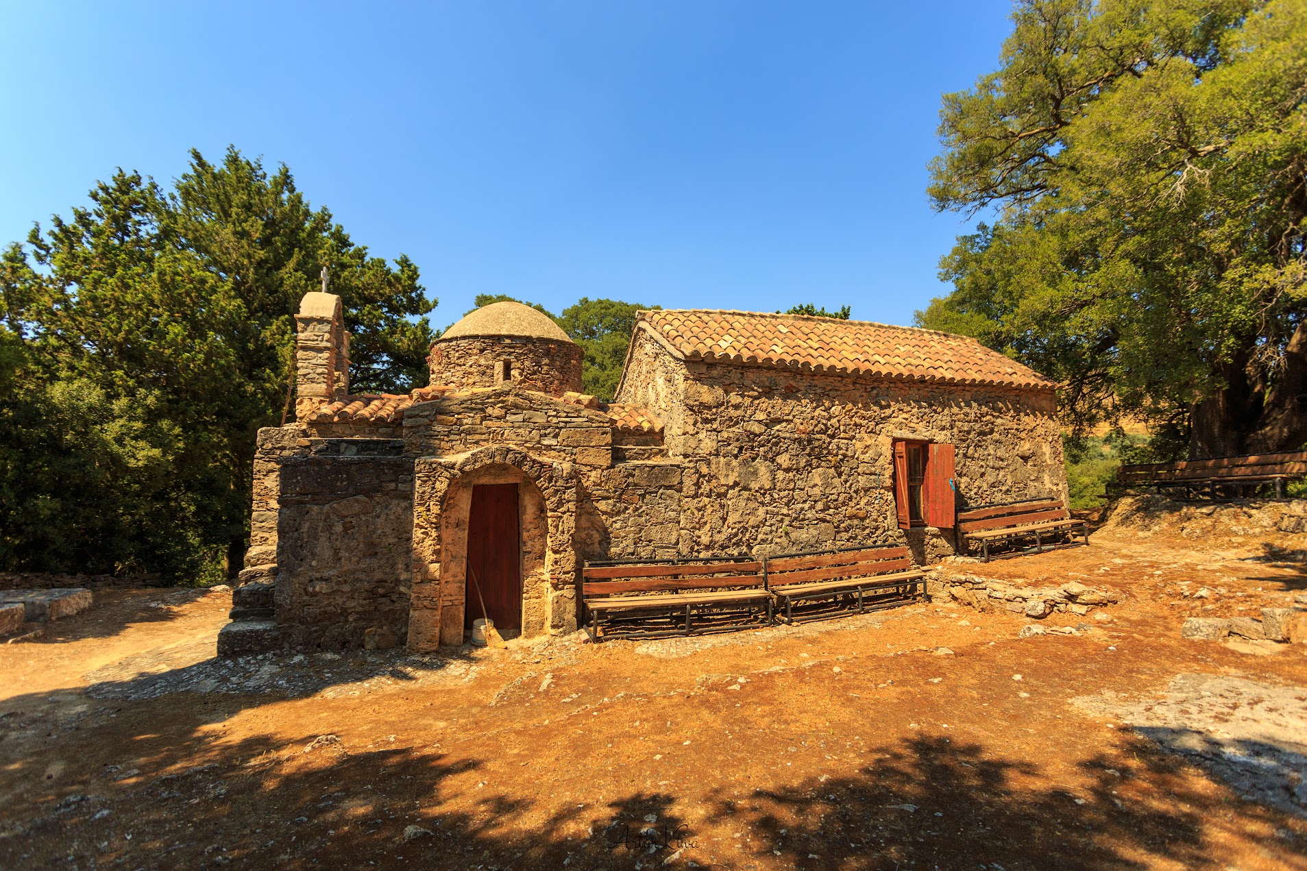 Ναός Σωτήρος Χριστού στο Τεμένια — Naós Sōtḗros Christoú sto Teménia Kościół „Pana Zbawiciela” w miejscowości Temenia (Selino) to przykład wiejskiej świątyni, która mimo skromnych rozmiarów zachowuje niezwykłą głębię artystyczną i historyczną. Usytuowany w zacisznej części wioski, otoczony gajami oliwnymi i krajobrazem południowo-zachodniej Krety, kościół jest świadectwem średniowiecznej wiary, lokalnej wspólnoty i zmieniających się stylów artystycznych. Powstał w dwóch fazach — pierwsza, jednonawowa, pochodzi z XIII wieku, druga, z XIV wieku, dobudowała zachodnią część z kopułą — i nosi ślady zarówno tradycji bizantyjskiej, jak i wpływów zachodnich. To miejsce, które pozwala dostrzec, że nawet najmniejsze osady Krety były w średniowieczu miejscem kontemplacji, sztuki i wspólnotowego życia.