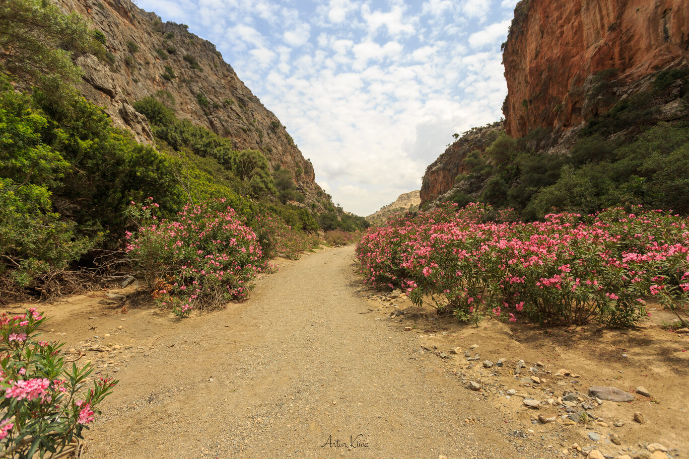 Krajobraz jest typowy dla Asterousiów: wysokie, pionowe ściany z jasnego wapienia, w których erozja wygryzła dziesiątki grot i nisz, kępy oleandrów wzdłuż koryta i rozrzucone po stokach jałowce oraz krzewiaste dęby. W wielu opisach powtarza się motyw „spaceru dnem potoku” – w praktyce idzie się szerokim, suchym korytem, otoczonym stromymi skałami, które im bliżej morza, tym bardziej się zbliżają, tworząc niemal kanion.