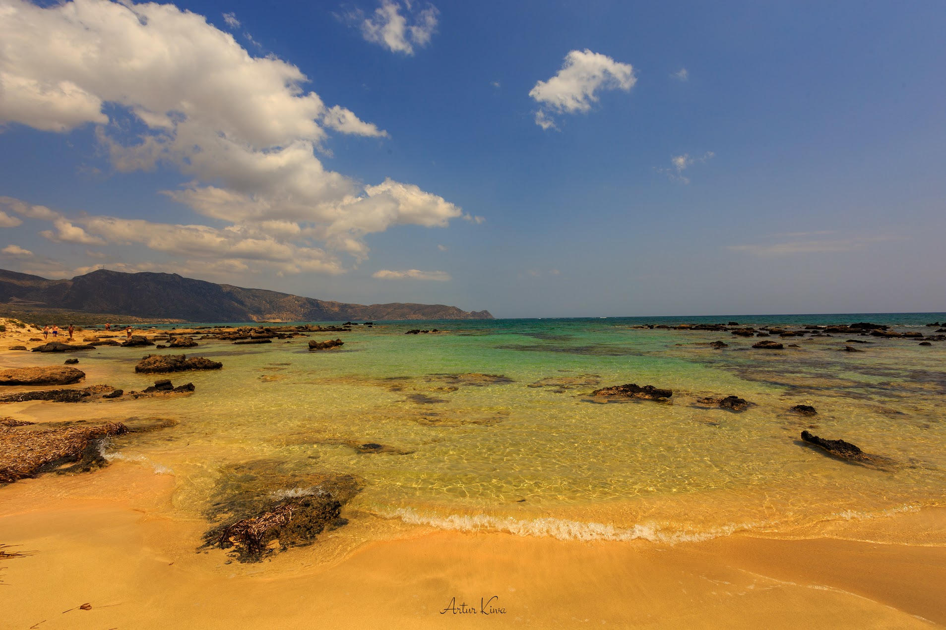 Elafonisi to w istocie niewielka wyspa oddzielona od lądu płycizną, którą można przejść pieszo – woda sięga tu ledwie do kolan. Jej nazwa, oznaczająca „Wyspę Jeleni”, nawiązuje do dawnego krajobrazu i dzikiej przyrody tego miejsca. Piasek przybiera odcienie różu dzięki drobnym fragmentom muszli, które przez tysiące lat rozdrabniało morze.