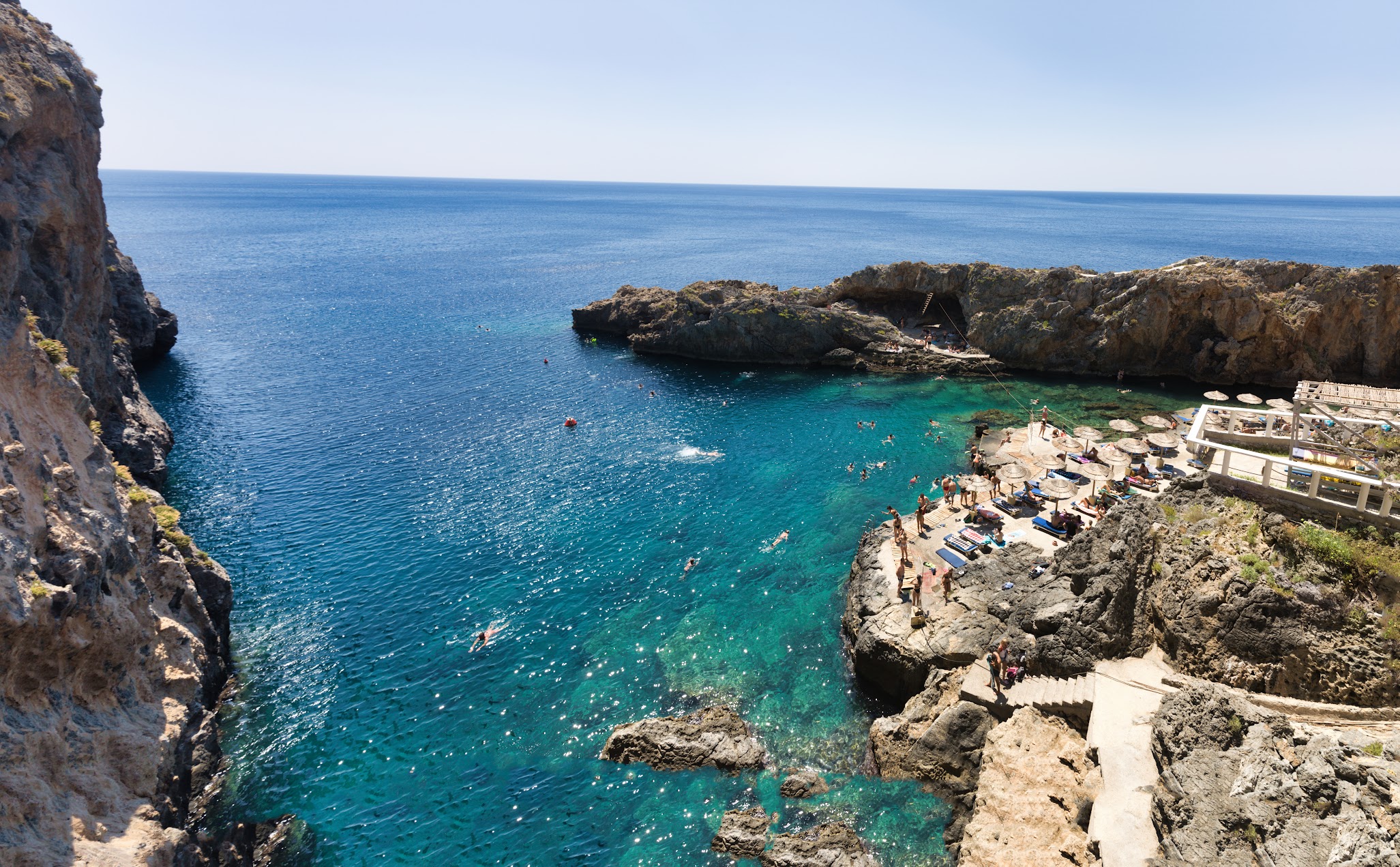 Zatoka Kalypso ma unikalny, niemal teatralny charakter – przypomina skalny amfiteatr, w którym morze gra główną rolę. Jej strome brzegi sprawiają, że woda jest tu głęboka już kilka metrów od brzegu, a jej kolor przechodzi od szmaragdu po granat. To ulubione miejsce miłośników nurkowania i snorkelingu – w krystalicznie czystej wodzie widać skały, ryby i podwodne jaskinie.