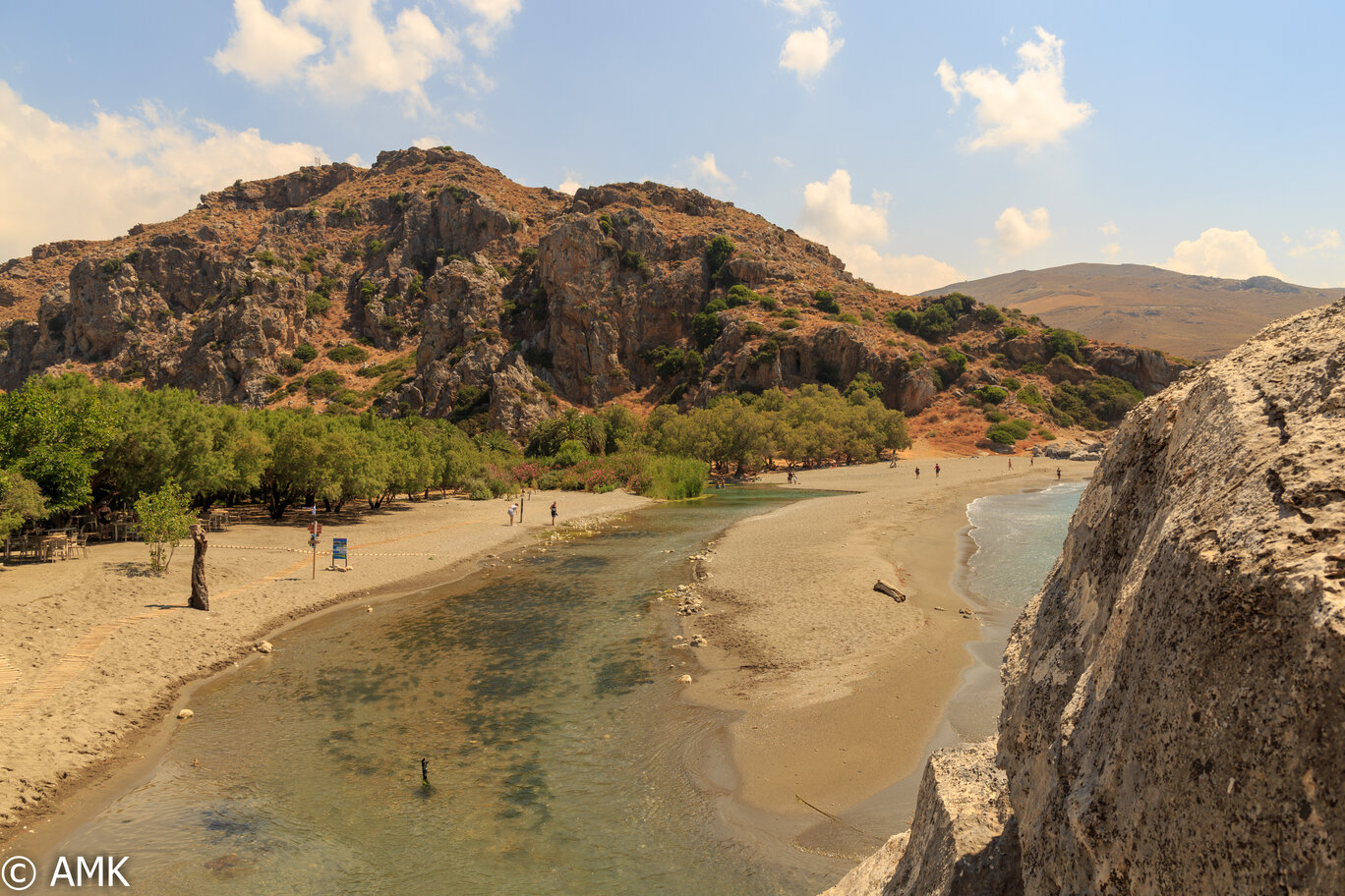 Plaża Preveli to jedno z najbardziej charakterystycznych miejsc południowej Krety – laguna, w której rzeka Megalopotamos spotyka się z Morzem Libijskim, tworząc zieloną oazę palm i źródeł pośród gór. Znajduje się około 35 km na południe od Rethymno, u stóp słynnego klasztoru Moni Preveli. Widok z punktu widokowego nad zatoką należy do najbardziej rozpoznawalnych obrazów Krety – zakole rzeki wśród gajów palmowych i szmaragdowe morze w tle.